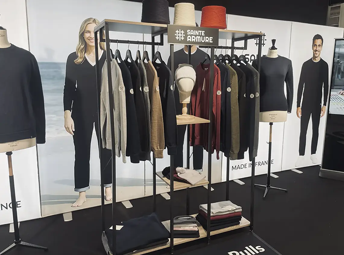 Côté retail, Sainte Armure propose un corner clair : un assortiment resserré qui évite l’effet «mur de choix», des mailles fines faciles à coordonner, et une palette de coloris lisible.